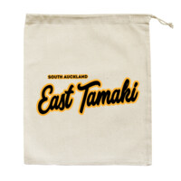 This bag is simple, humble and useful. It can be easily folded and tucked away and used for a multitude of purposes. It is made with 140gsm calico cotton and features drawstring closing.